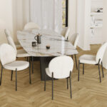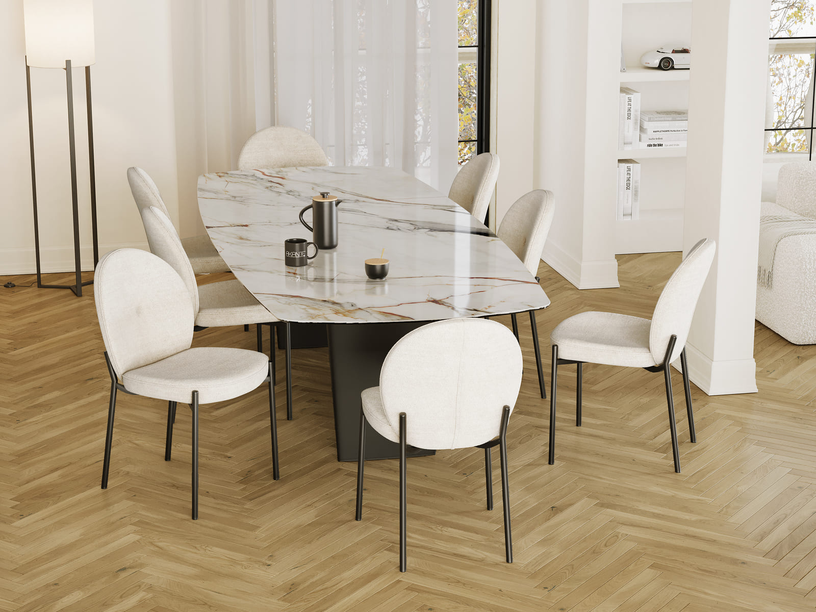Son assise en tissu doux et résistant garantit un confort optimal au quotidien, avec une finition soignée qui met en valeur le design contemporain de la chaise. Les tissus sont disponibles dans plusieurs coloris raffinés :