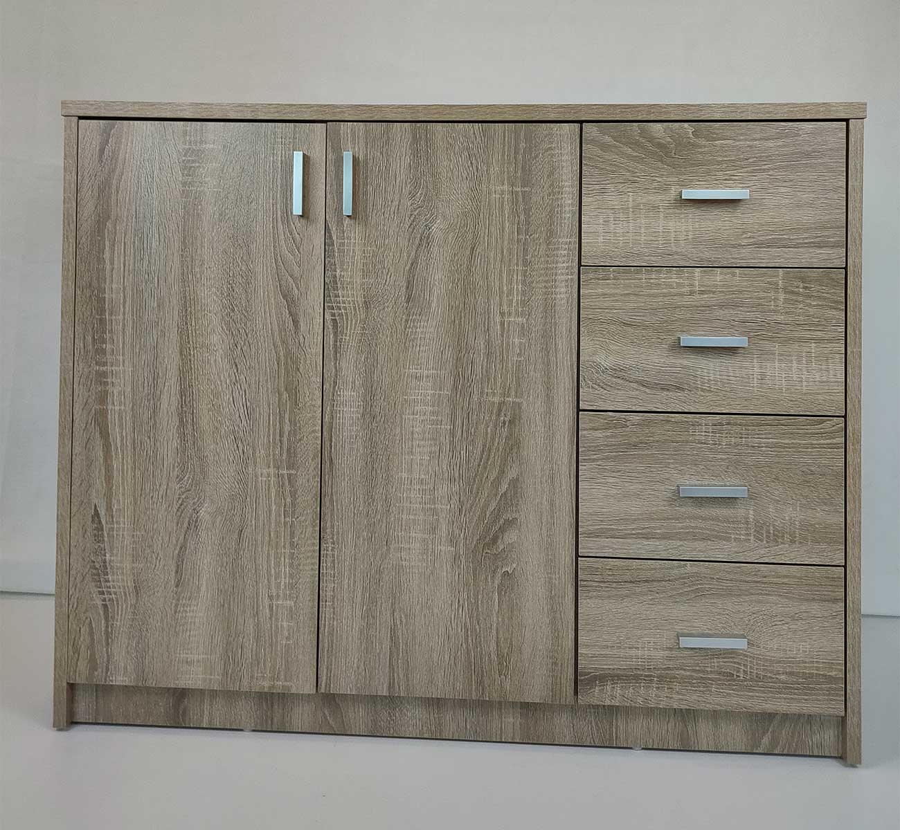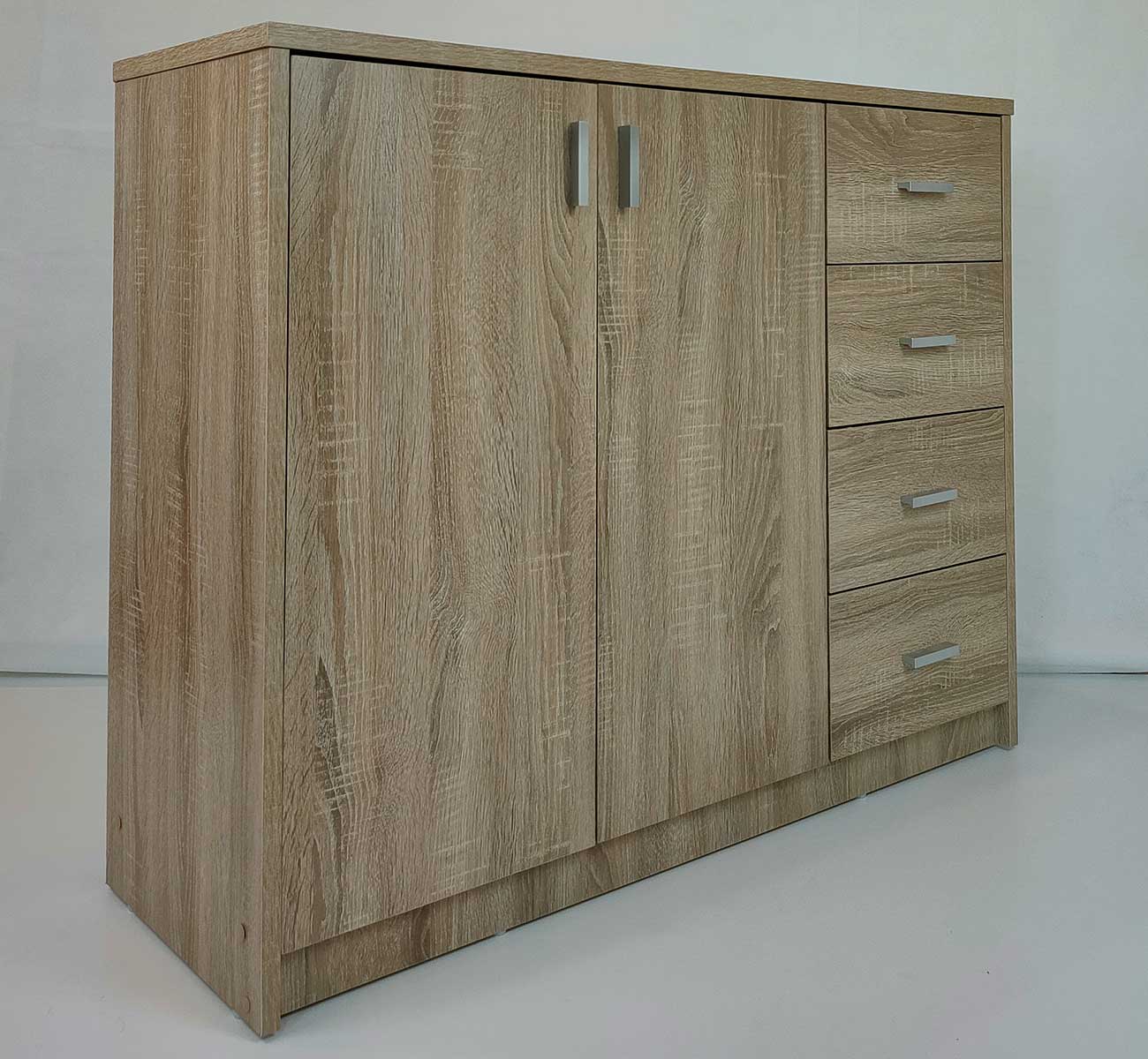 Fabriquée à partir de matériaux de qualité supérieure (MDF, panneaux de particules, bords ABS) et le décor en chêne Sonoma, cette commode est à la fois robuste et élégante.