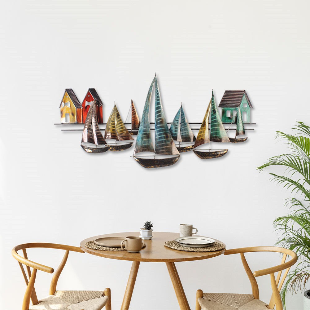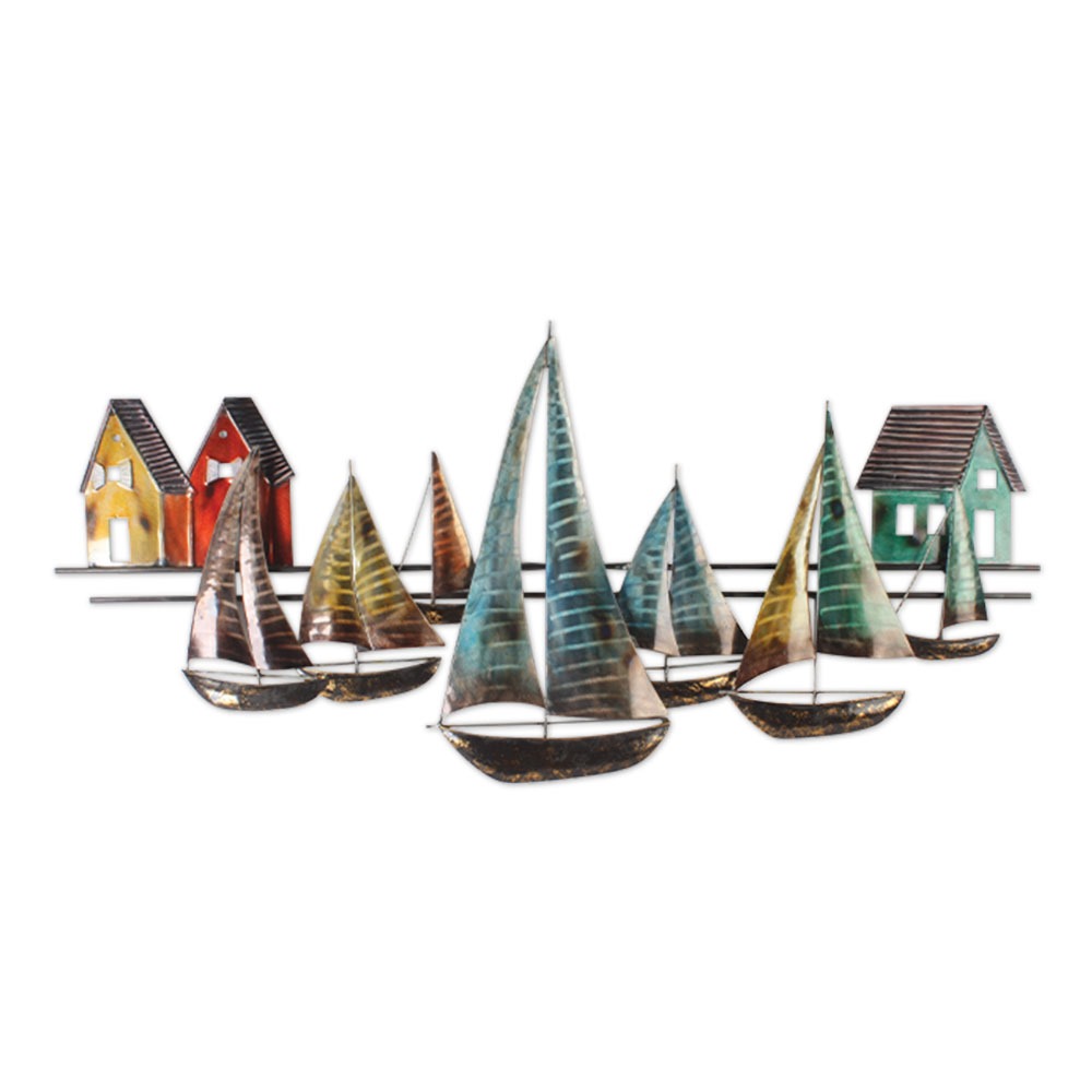 Apportez une bouffée d’air marin et une touche de charme authentique à votre intérieur avec cette superbe décoration murale en métal. « La Baie Tranquille » dépeint une scène pittoresque d’un village côtier, où les maisons aux façades colorées se reflètent dans l’eau calme du port, tandis que les voiliers, amarrés ou voguant au loin, ajoutent une note de mouvement et de liberté.