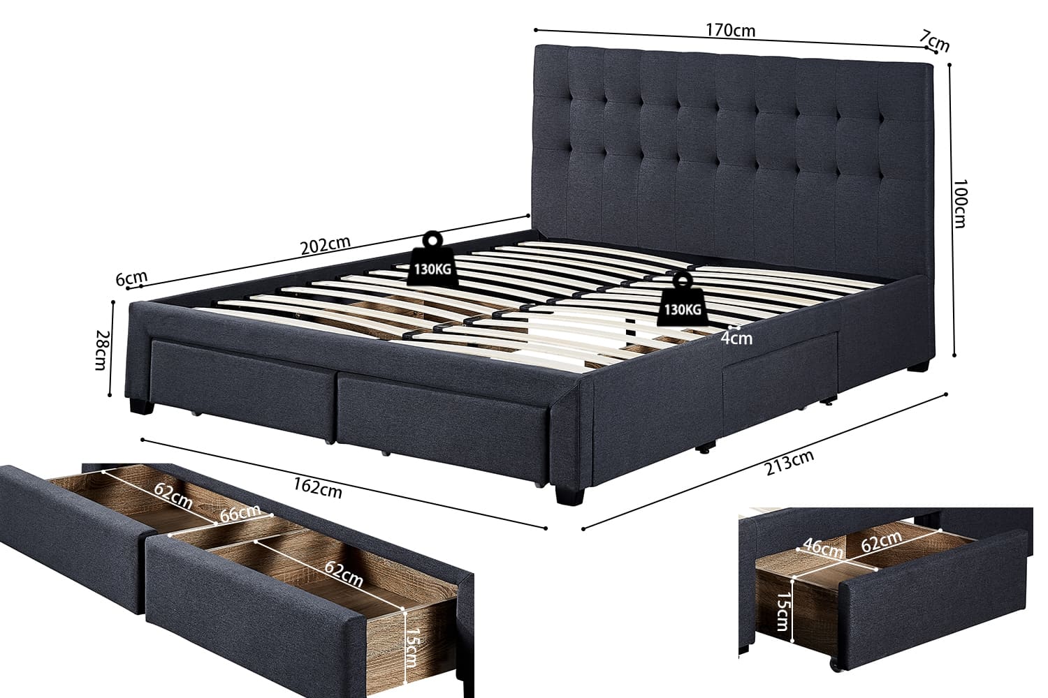 Doté de deux grands tiroirs de rangement intégrés, il offre un espace discret pour organiser couvertures, draps et coussins, vous permettant ainsi d’optimiser votre chambre sans encombrer l’espace.