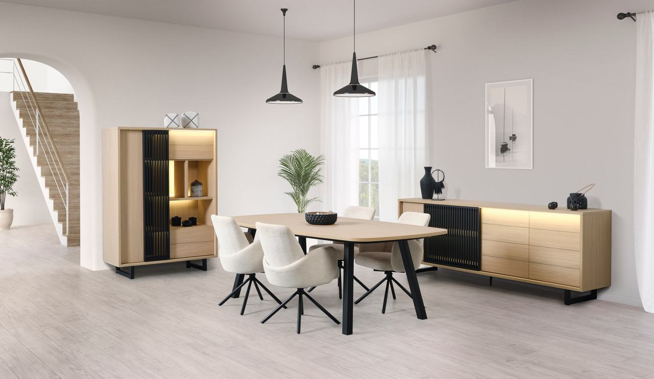 Le panneau métallique noir ajouré renforce l’identité visuelle de la collection, créant un contraste élégant avec le bois.