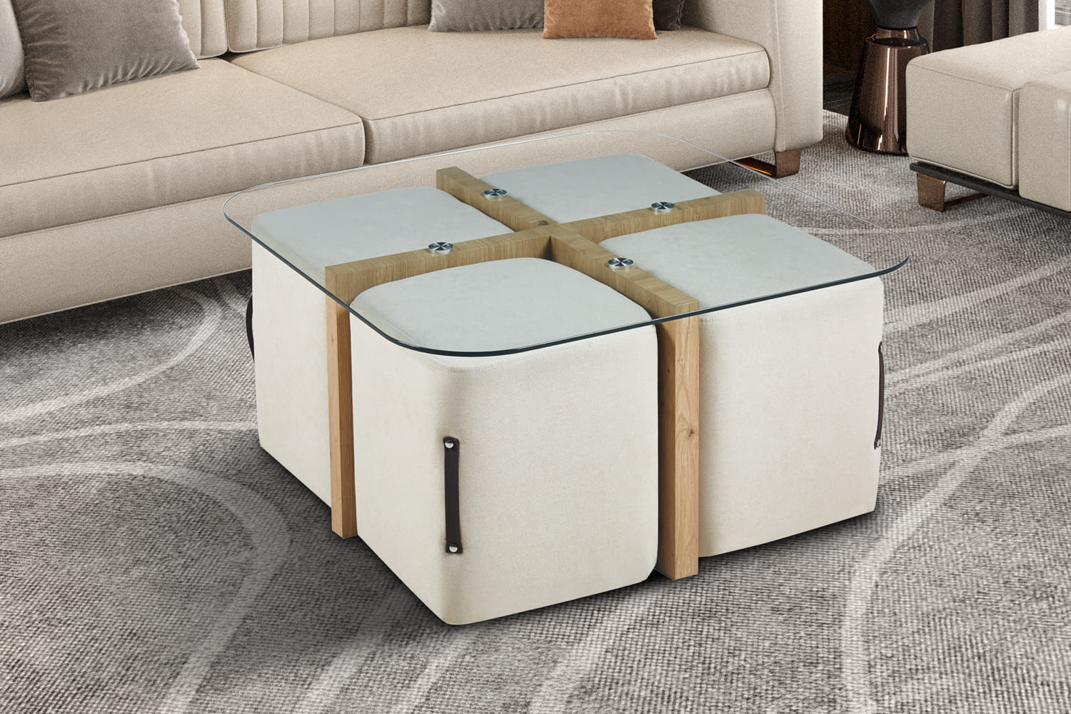 Mais ce qui rend la table SHANA vraiment unique, c’est son astucieux système de rangement intégré : sous le plateau, vous trouverez quatre poufs en tissu parfaitement ajustés pour optimiser l’espace.