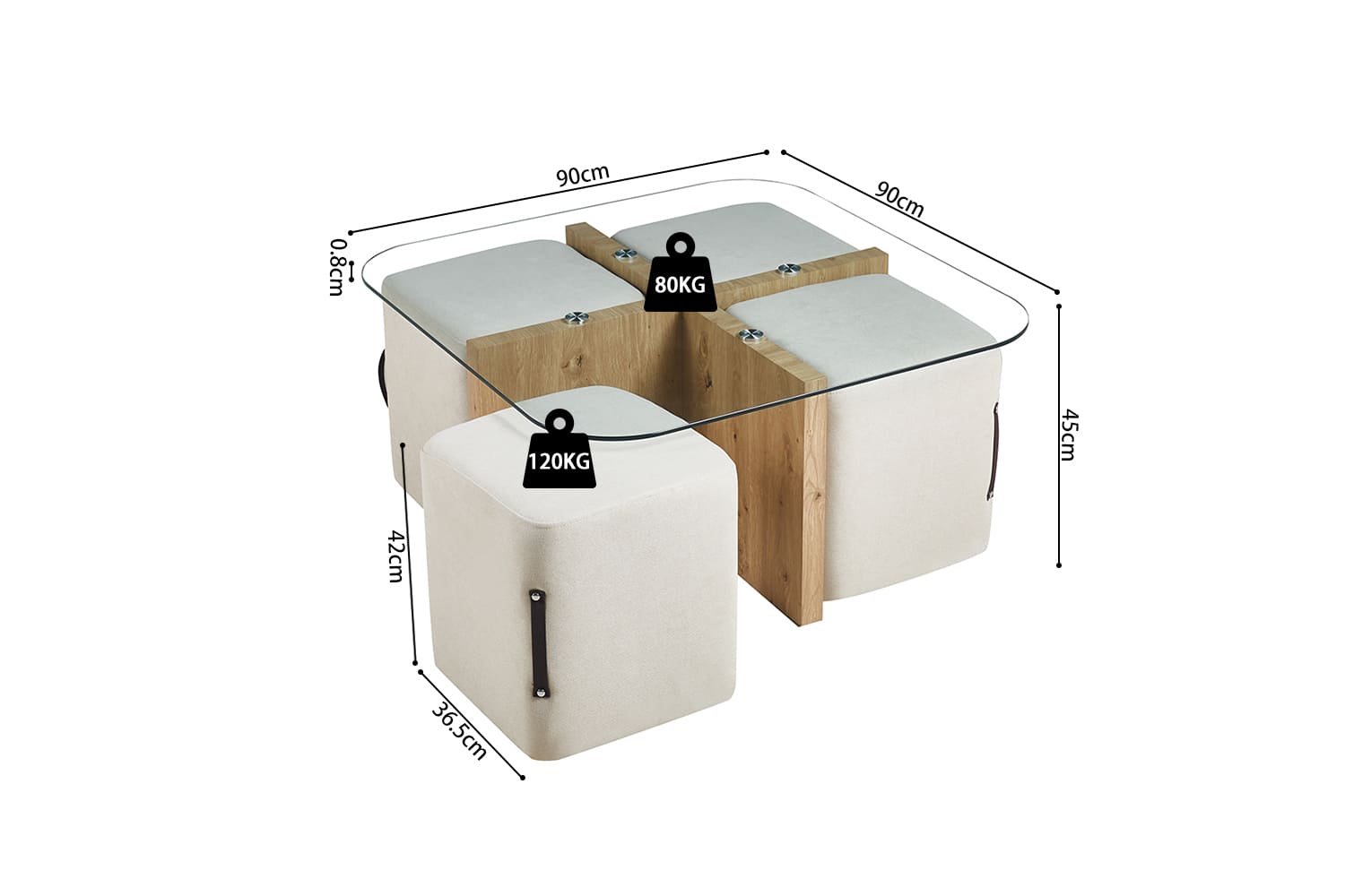 – 4 poufs intégrés : un gain de place astucieux, avec des poufs en tissu confortables qui se glissent sous la table pour une solution de rangement pratique et des assises supplémentaires.