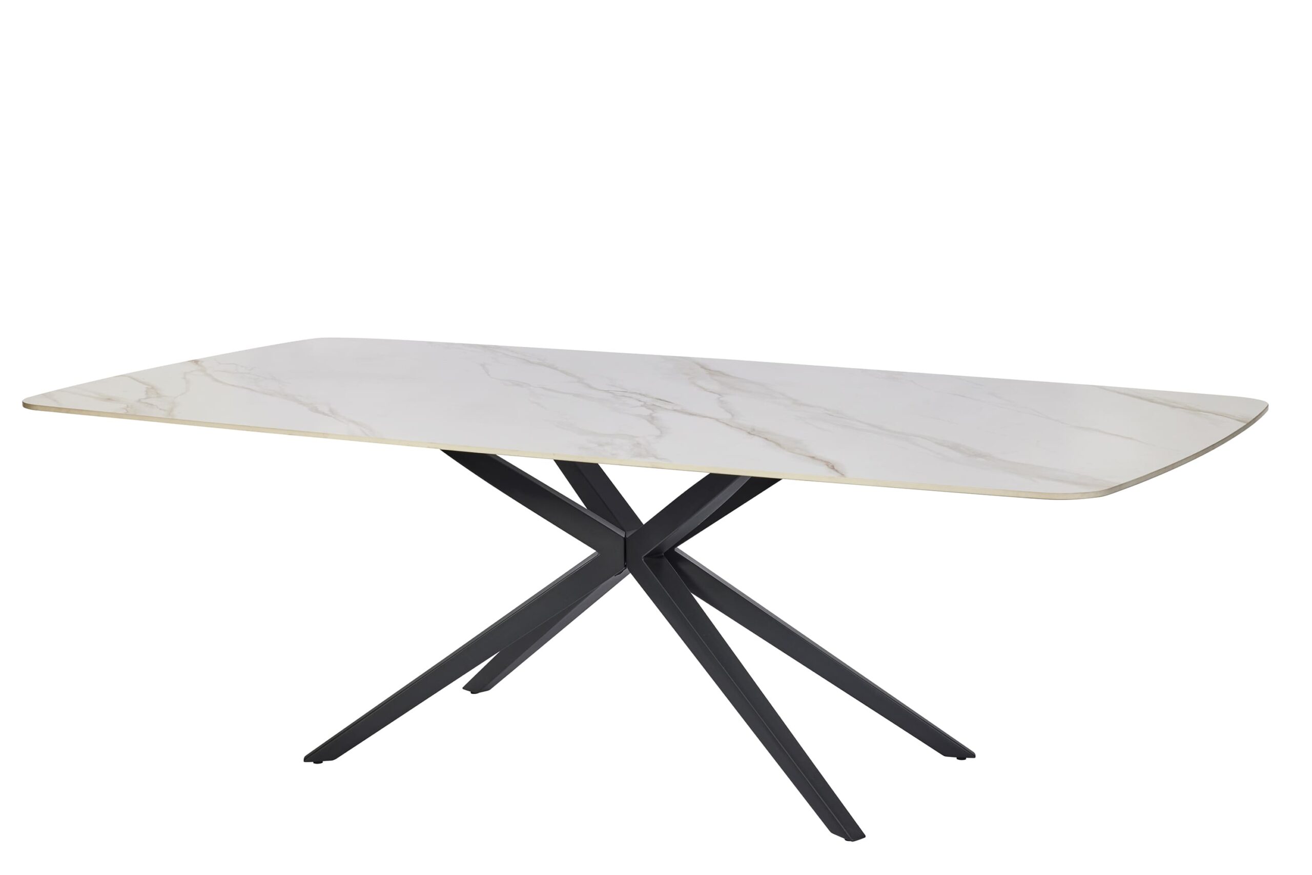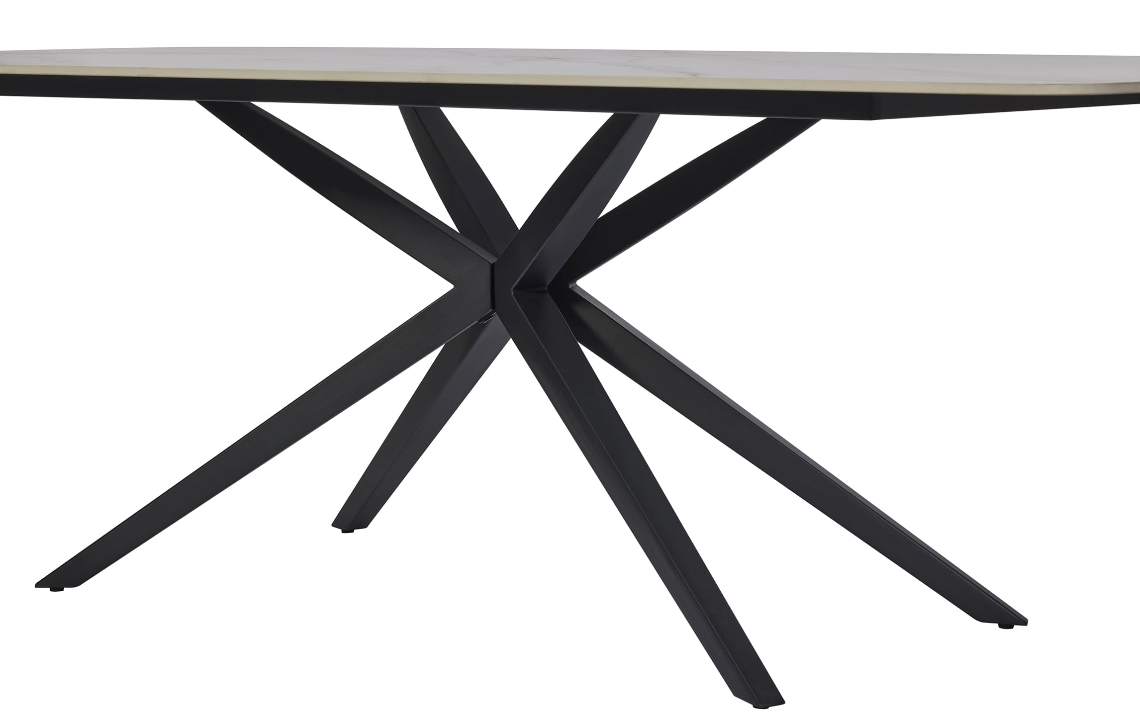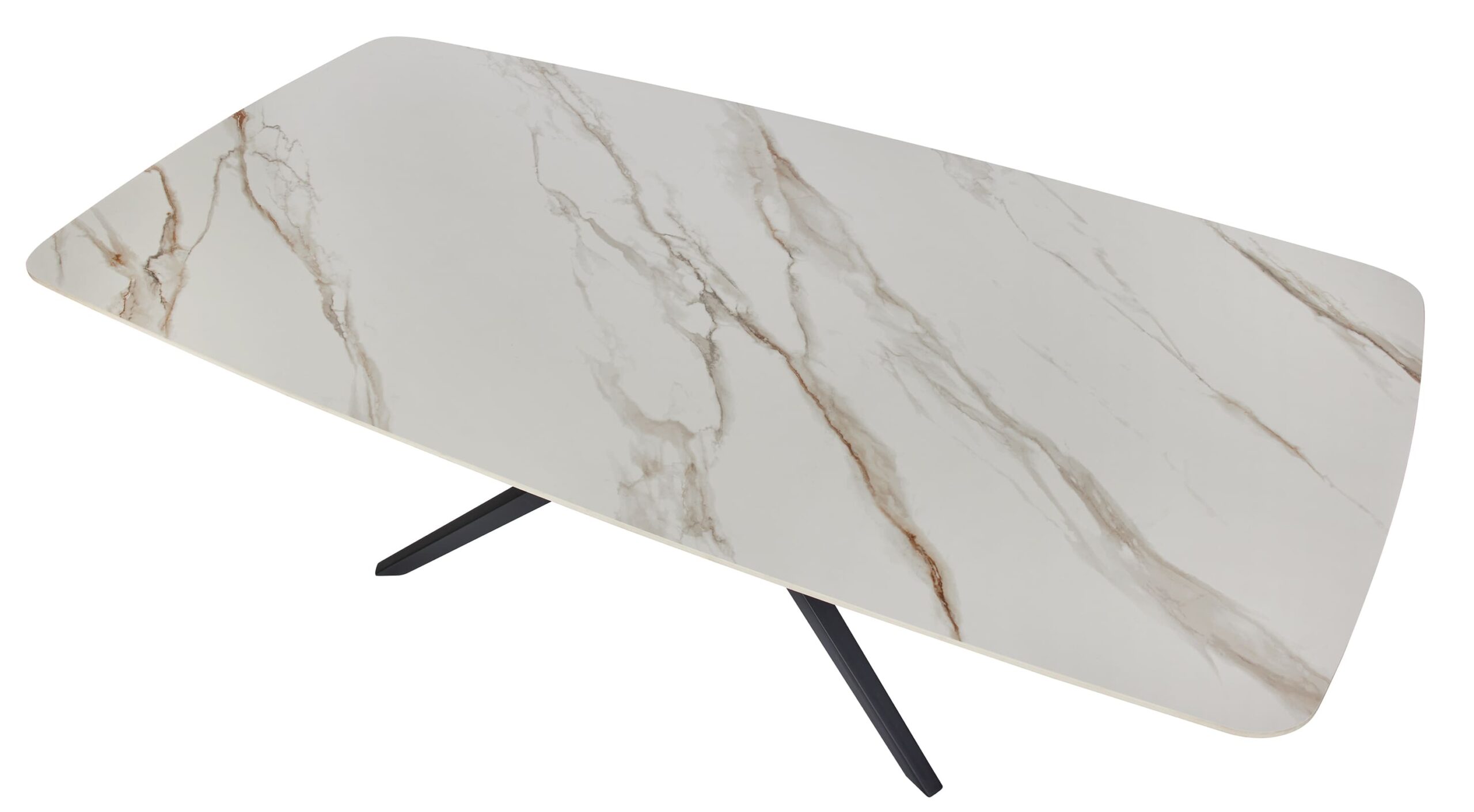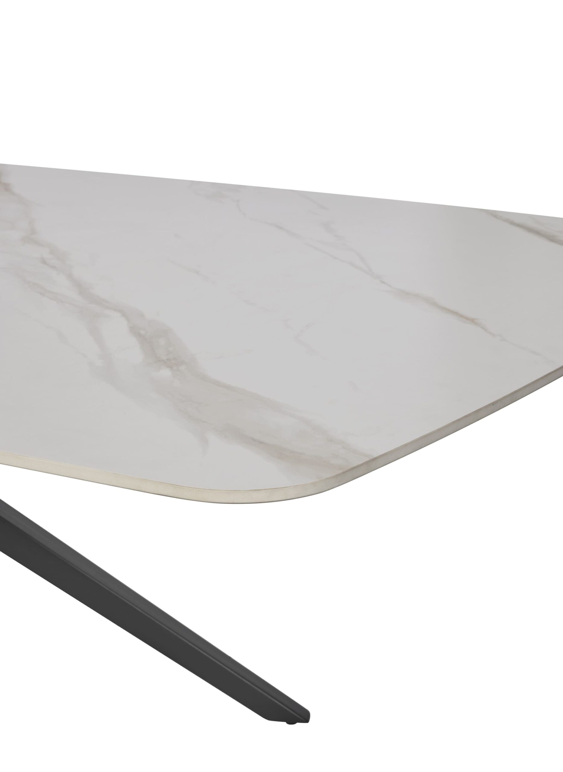 Le contraste entre le blanc du plateau en céramique et le noir du piétement en métal crée un effet visuel saisissant et très tendance.