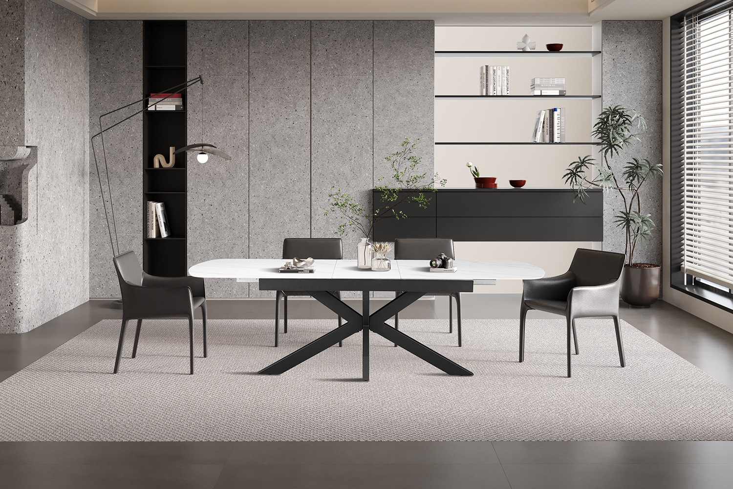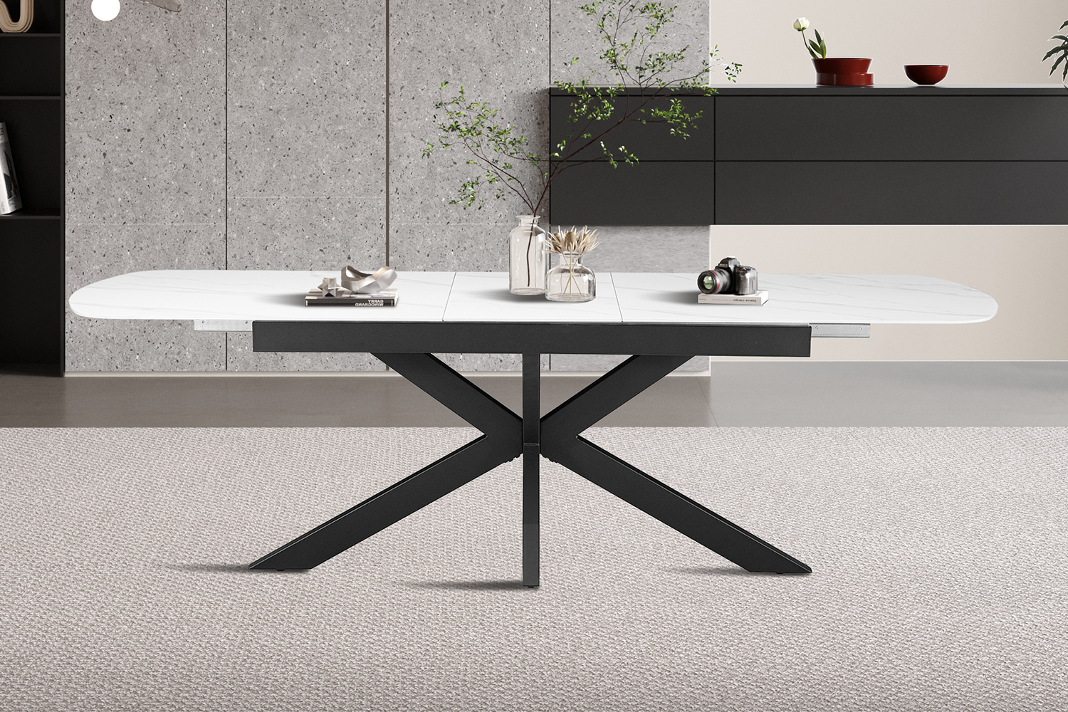 Son mécanisme d’extension automatique permet de passer facilement de 180 à 220 cm : en tirant sur les extrémités du plateau, la rallonge centrale se soulève et s’ajuste automatiquement, créant une surface continue. Un simple mouvement inverse suffit à replier la rallonge et à retrouver la taille compacte d’origine.