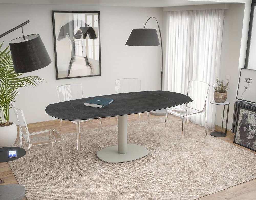 La table de repas GROELAND possède deux rallonges qui se placent automatiquement en actionnant la tige en dessous du plateau.